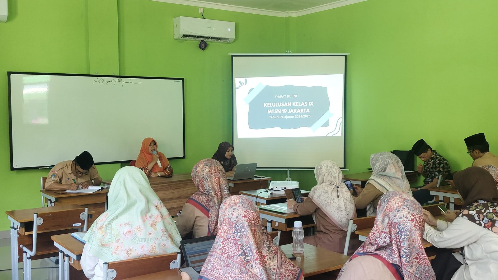 Jakarta (Humas MTsN 19 Jakarta Selatan) — Madrasah Tsanawiyah Negeri (MTsN) 19 Jakarta Selatan menggelar Rapat Pleno Kelulusan bagi siswa-siswi kelas IX angkatan ke-28 Tahun Pelajaran 2024/2025 pada Selasa (28/5/2025). Kegiatan berlangsung di ruang kelas baru gedung SBSN MTsN 19 Jakarta Selatan.